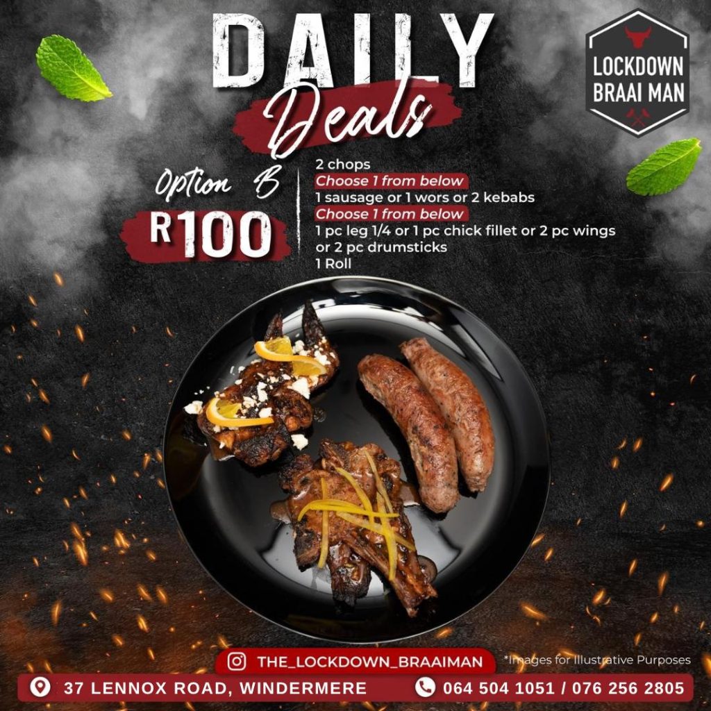 2 Chops + ( 2 Sausages or 2 Wors ) + ( 1 x Chicken Fillet or 1 x Leg Quarter ) + 1 Roll