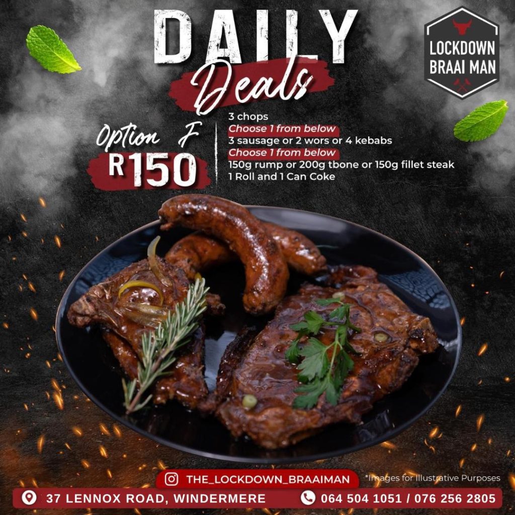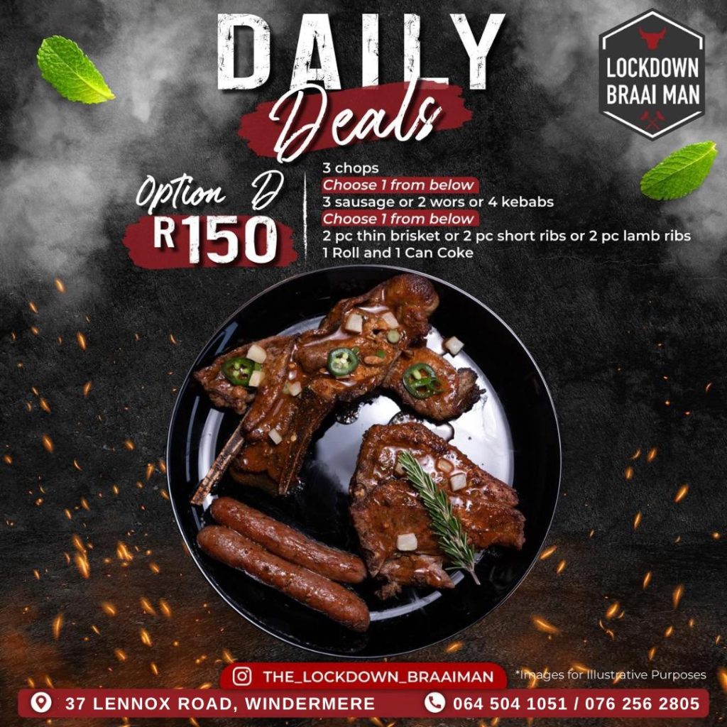 1 Rump (150g) +1 Sausage or 1 Wors + 2 Chops + 1 Short Rib + 1 roll