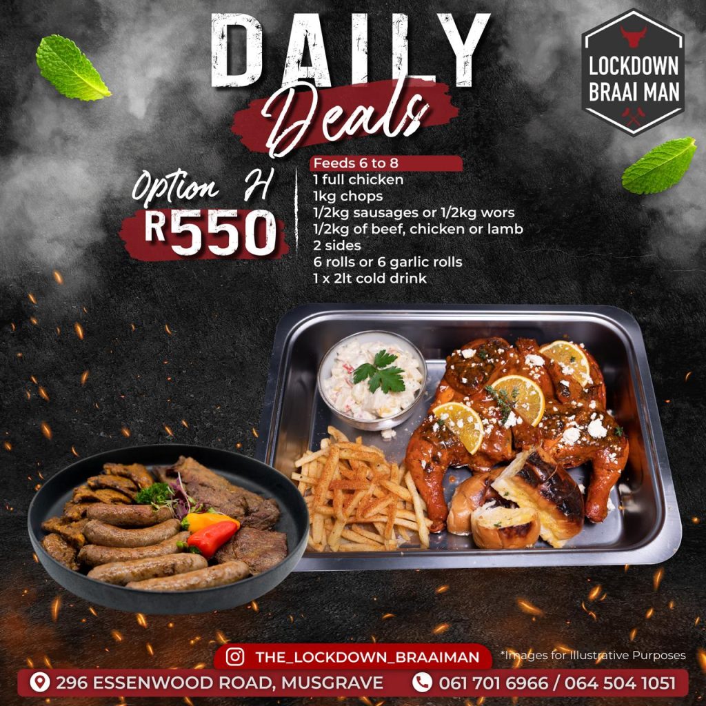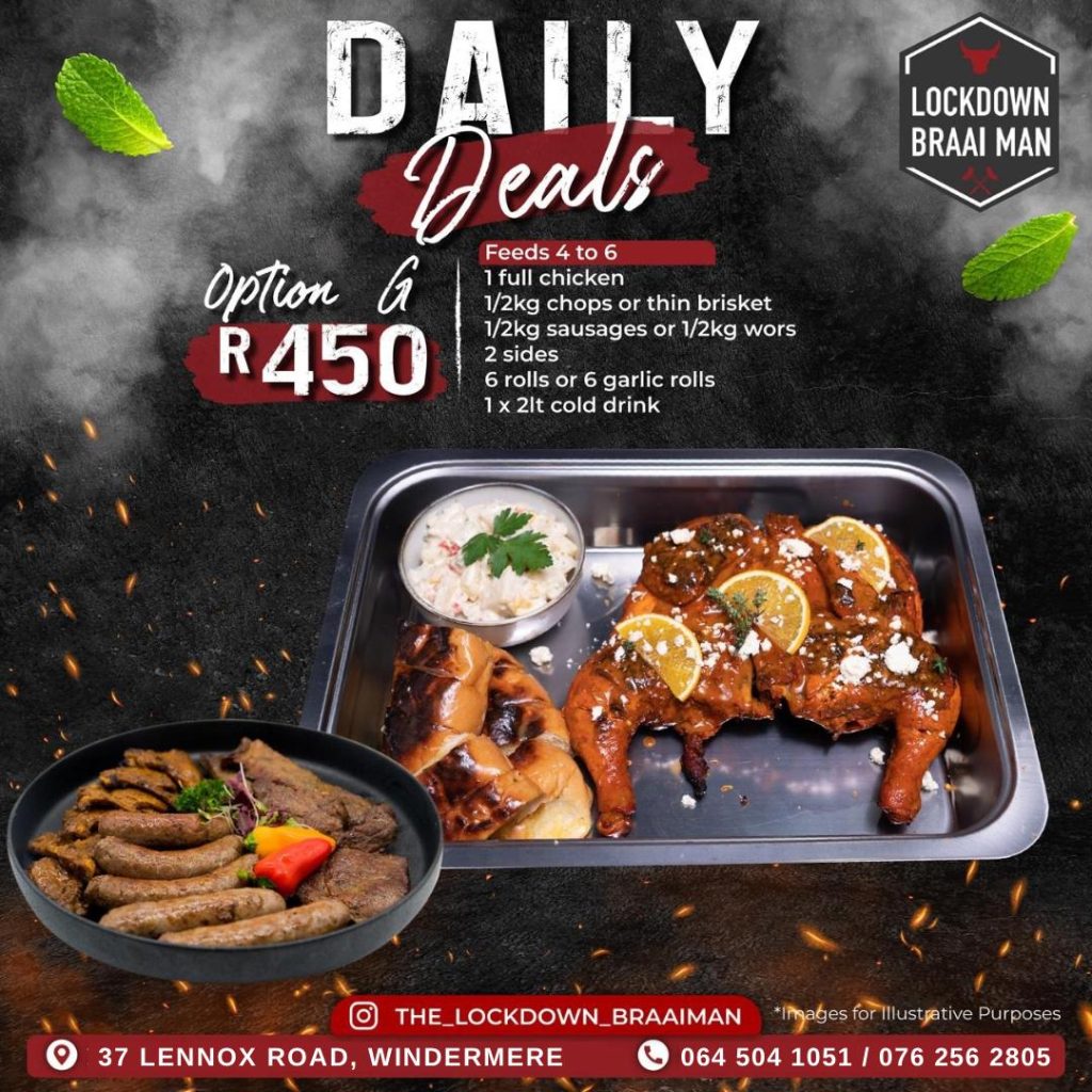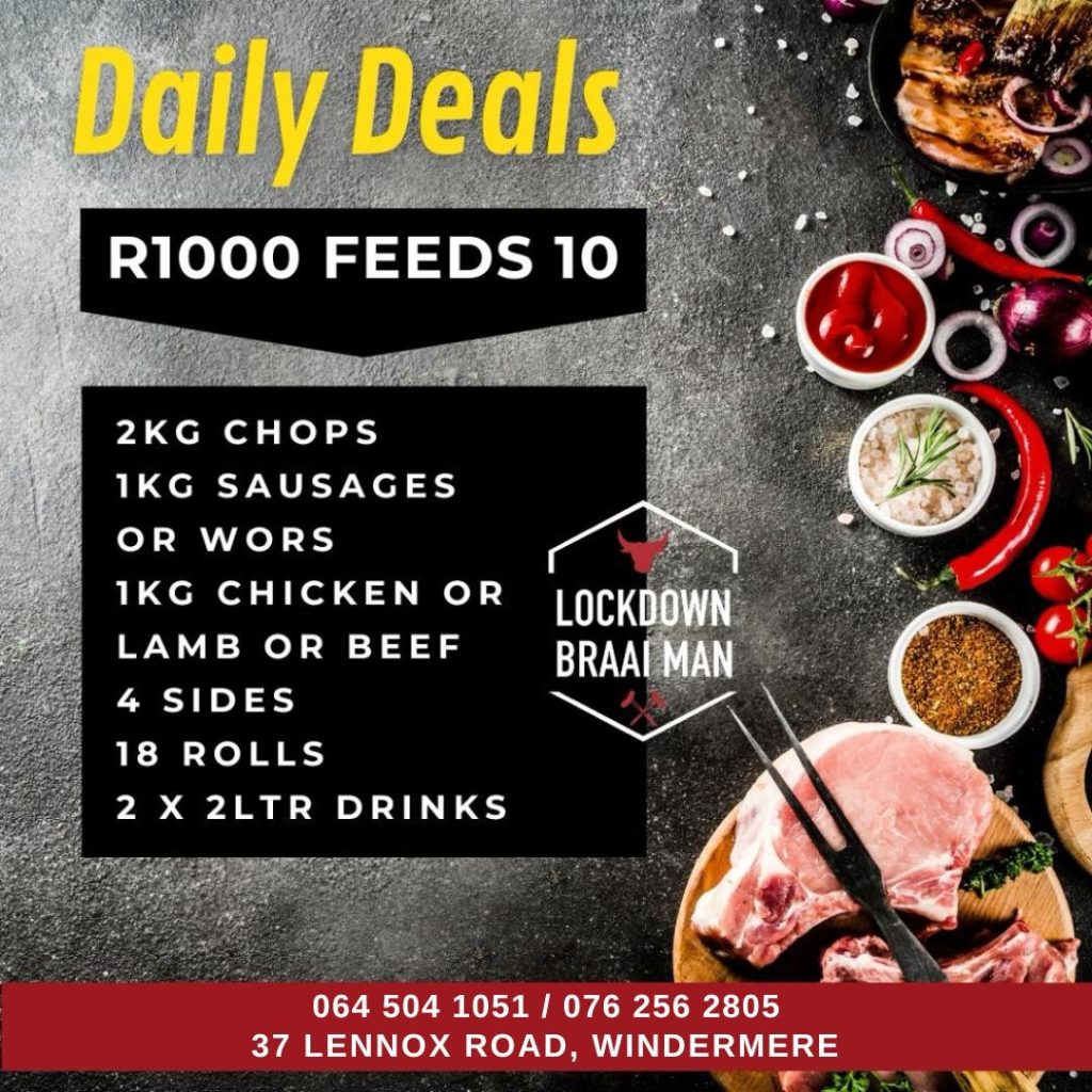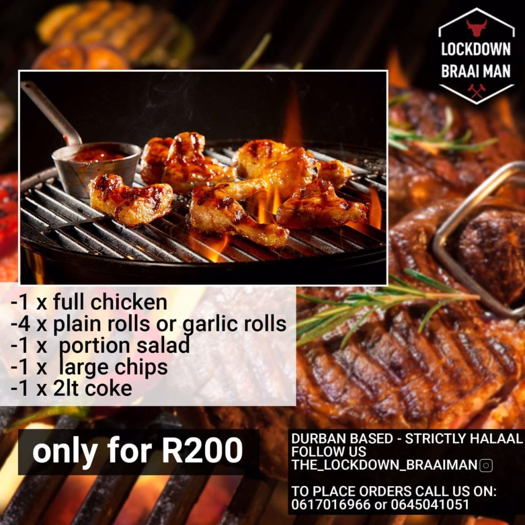6 Chops + ( 8 Sausages or 5 Wors) +( 5 Chick Wings or 5 Drumsticks ) + 6 Rolls